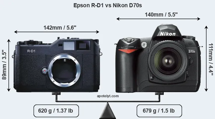 If the front view area (width x height) of the cameras is taken as an aggregate measure of their size, the Nikon D70s is notably larger (23 percent) than the Epson R-D1. Moreover, the D70s is markedly heavier (10 percent) than the R-D1. In this context, it is worth noting that neither the R-D1 nor the D70s are weather-sealed.
