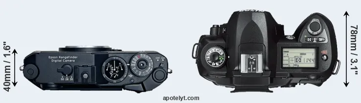 The side-by-side display below illustrates the physical size and weight of the Epson R-D1 and the Nikon D70s. The two cameras are presented according to their relative size. Three consecutive views from the front, the top, and the rear side are shown. All size dimensions are rounded to the nearest millimeter.