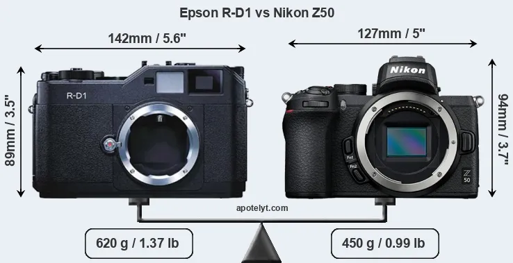 If the front view area (width x height) of the cameras is taken as an aggregate measure of their size, the Nikon Z50 is notably smaller (6 percent) than the Epson R-D1. Moreover, the Z50 is markedly lighter (27 percent) than the R-D1. It is noteworthy in this context that the Z50 is splash and dust-proof, while the R-D1 does not feature any corresponding weather-sealing.