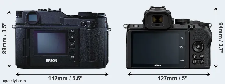 An illustration of the physical size and weight of the Epson R-D1 and the Nikon Z50 is provided in the side-by-side display below. The two cameras are presented according to their relative size. Three successive views from the front, the top, and the rear are shown. All width, height and depth dimensions are rounded to the nearest millimeter.