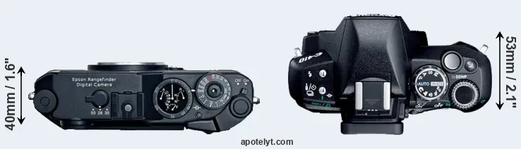 The physical size and weight of the Epson R-D1 and the Olympus E-410 are illustrated in the side-by-side display below. The two cameras are presented according to their relative size. Three successive views from the front, the top, and the rear are shown. All width, height and depth measures are rounded to the nearest millimeter.