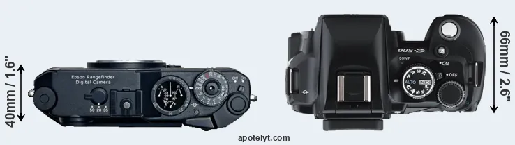 An illustration of the physical size and weight of the Epson R-D1 and the Olympus E-500 is provided in the side-by-side display below. The two cameras are presented according to their relative size. Three consecutive perspectives from the front, the top, and the back are available. All width, height and depth measures are rounded to the nearest millimeter.