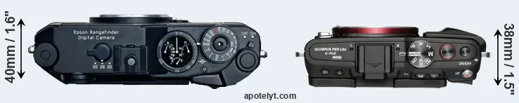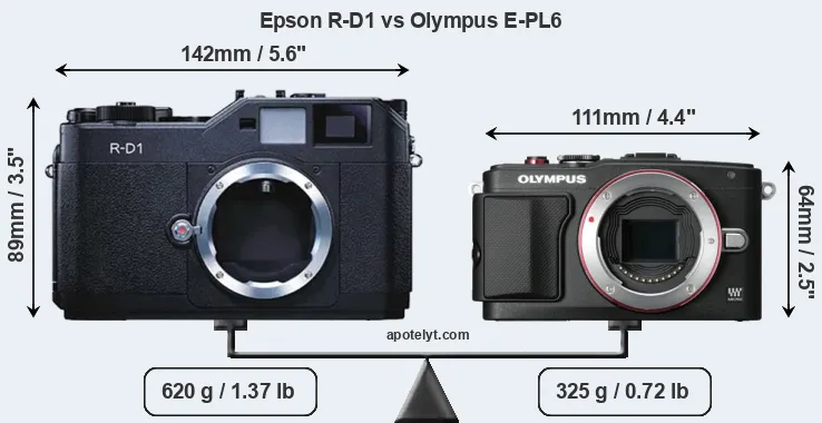 The physical size and weight of the Epson R-D1 and the Olympus E-PL6 are illustrated in the side-by-side display below. The two cameras are presented according to their relative size. Three consecutive perspectives from the front, the top, and the back are available. All width, height and depth dimensions are rounded to the nearest millimeter.