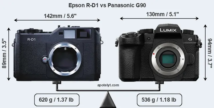 The physical size and weight of the Epson R-D1 and the Panasonic G90 are illustrated in the side-by-side display below. The two cameras are presented according to their relative size. Three successive views from the front, the top, and the rear are shown. All width, height and depth measures are rounded to the nearest millimeter.