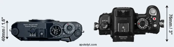 The side-by-side display below illustrates the physical size and weight of the Epson R-D1 and the Panasonic GH2. The two cameras are presented according to their relative size. Three consecutive views from the front, the top, and the rear side are shown. All width, height and depth dimensions are rounded to the nearest millimeter.