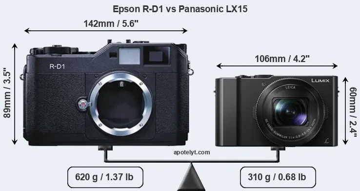 If the front view area (width x height) of the cameras is taken as an aggregate measure of their size, the Panasonic LX15 is considerably smaller (50 percent) than the Epson R-D1. In this context, it is worth noting that neither the R-D1 nor the LX15 are weather-sealed.