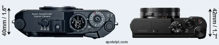 The Epson R-D1 and the Panasonic Lumix DMC-LX15 (labelled Panasonic LX10 in some countries) are two digital cameras that were officially introduced, respectively, in March 2004 and September 2016. The R-D1 is a rangefinder-focusing mirrorless camera, while the LX15 is a fixed lens compact. The cameras are based on an APS-C (R-D1) and an one-inch (LX15) sensor. The Epson has a resolution of 6 megapixels, whereas the Panasonic provides 20 MP.