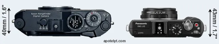 The physical size and weight of the Epson R-D1 and the Panasonic LX5 are illustrated in the side-by-side display below. The two cameras are presented according to their relative size. Three consecutive views from the front, the top, and the rear side are shown. All width, height and depth measures are rounded to the nearest millimeter.