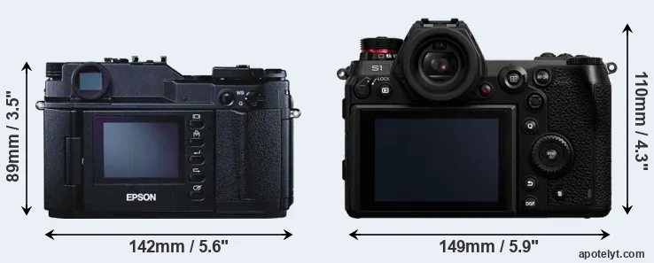 If the front view area (width x height) of the cameras is taken as an aggregate measure of their size, the Panasonic S1 is notably larger (30 percent) than the Epson R-D1. Moreover, the S1 is substantially heavier (64 percent) than the R-D1. It is noteworthy in this context that the S1 is splash and dust-proof, while the R-D1 does not feature any corresponding weather-sealing.