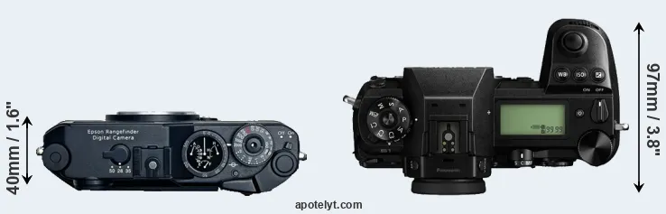 An illustration of the physical size and weight of the Epson R-D1 and the Panasonic S1 is provided in the side-by-side display below. The two cameras are presented according to their relative size. Three consecutive perspectives from the front, the top, and the back are available. All width, height and depth dimensions are rounded to the nearest millimeter.