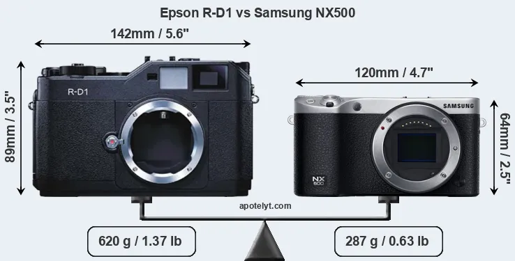 If the front view area (width x height) of the cameras is taken as an aggregate measure of their size, the Samsung NX500 is considerably smaller (39 percent) than the Epson R-D1. Moreover, the NX500 is substantially lighter (54 percent) than the R-D1. In this context, it is worth noting that neither the R-D1 nor the NX500 are weather-sealed.