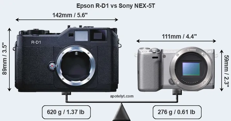 If the front view area (width x height) of the cameras is taken as an aggregate measure of their size, the Sony NEX-5T is considerably smaller (48 percent) than the Epson R-D1. Moreover, the NEX-5T is substantially lighter (55 percent) than the R-D1. In this context, it is worth noting that neither the R-D1 nor the NEX-5T are weather-sealed.