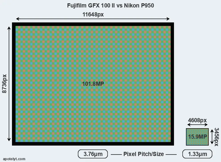 | Sensor Specs | Fujifilm GFX 100 II | Nikon P950 |