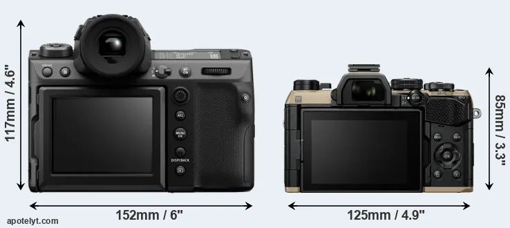The side-by-side display below illustrates the physical size and weight of the Fujifilm GFX 100 II and the OM System OM-5 II. The two cameras are presented according to their relative size. Three consecutive perspectives from the front, the top, and the back are available. All size dimensions are rounded to the nearest millimeter.