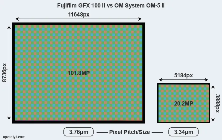 | Sensor Specs | Fujifilm GFX 100 II | OM System OM-5 II |