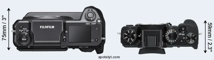 The physical size and weight of the Fujifilm GFX 100 and the Fujifilm X-T3 are illustrated in the side-by-side display below. The two cameras are presented according to their relative size. Three consecutive views from the front, the top, and the rear side are shown. All size dimensions are rounded to the nearest millimeter.