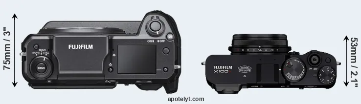 If the front view area (width x height) of the cameras is taken as an aggregate measure of their size, the Fujifilm X100V is considerably smaller (57 percent) than the Fujifilm GFX 100. In this context, it is worth noting that both cameras are splash and dust-proof and can, hence, be used in inclement weather conditions or harsh environments.