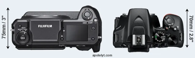 The physical size and weight of the Fujifilm GFX 100 and the Nikon D3500 are illustrated in the side-by-side display below. The two cameras are presented according to their relative size. Three consecutive perspectives from the front, the top, and the back are available. All width, height and depth dimensions are rounded to the nearest millimeter.