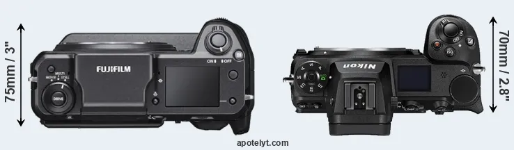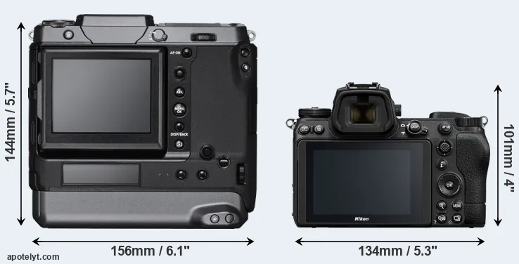 The side-by-side display below illustrates the physical size and weight of the Fujifilm GFX 100 and the Nikon Z6 II. The two cameras are presented according to their relative size. Three successive views from the front, the top, and the rear are shown. All width, height and depth dimensions are rounded to the nearest millimeter.