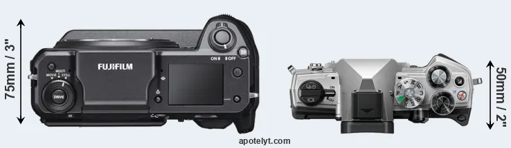 An illustration of the physical size and weight of the Fujifilm GFX 100 and the OM System OM-5 is provided in the side-by-side display below. The two cameras are presented according to their relative size. Three consecutive perspectives from the front, the top, and the back are available. All size dimensions are rounded to the nearest millimeter.