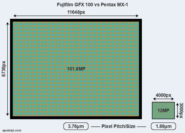 | Sensor Specs | Fujifilm GFX 100 | Pentax MX-1 |