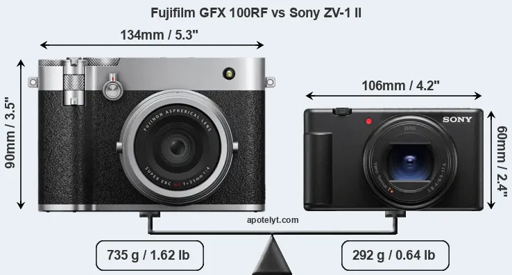 If the front view area (width x height) of the cameras is taken as an aggregate measure of their size, the Sony ZV-1 II is considerably smaller (47 percent) than the Fujifilm GFX 100RF. Moreover, the ZV-1 II is substantially lighter (60 percent) than the GFX 100RF. It is worth mentioning in this context that the GFX 100RF is splash and dust resistant, while the ZV-1 II does not feature any corresponding weather-sealing.