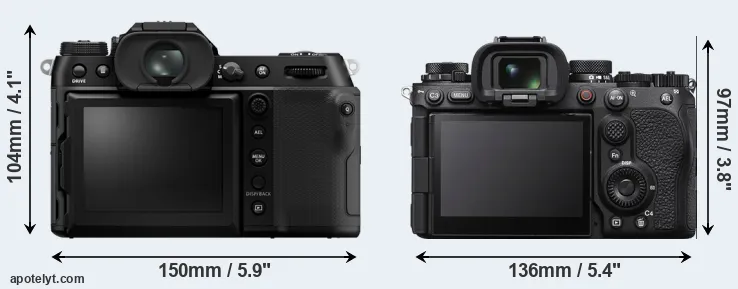 The physical size and weight of the Fujifilm GFX 100S II and the Sony A1 II are illustrated in the side-by-side display below. The two cameras are presented according to their relative size. Three successive views from the front, the top, and the rear are shown. All width, height and depth dimensions are rounded to the nearest millimeter.