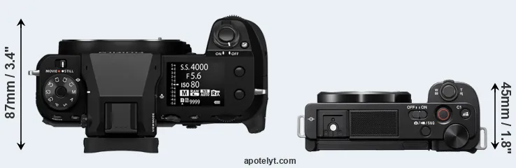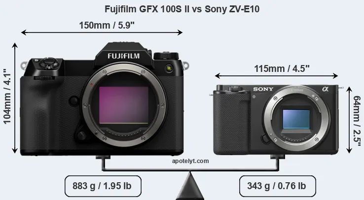 An illustration of the physical size and weight of the Fujifilm GFX 100S II and the Sony ZV-E10 is provided in the side-by-side display below. The two cameras are presented according to their relative size. Three consecutive perspectives from the front, the top, and the back are available. All width, height and depth dimensions are rounded to the nearest millimeter.