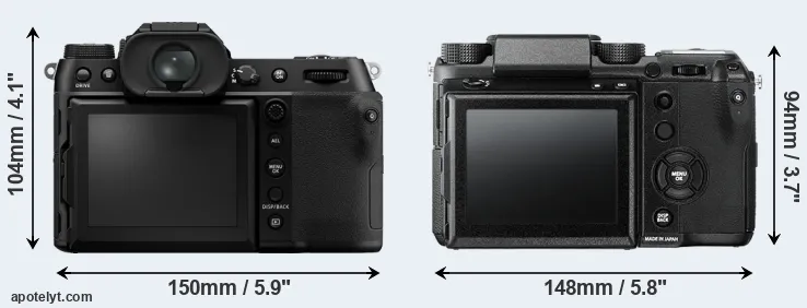 An illustration of the physical size and weight of the Fujifilm GFX 100S and the Fujifilm GFX 50S is provided in the side-by-side display below. The two cameras are presented according to their relative size. Three successive views from the front, the top, and the rear are shown. All width, height and depth measures are rounded to the nearest millimeter.