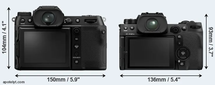 The side-by-side display below illustrates the physical size and weight of the Fujifilm GFX 100S and the Fujifilm X-H2S. The two cameras are presented according to their relative size. Three consecutive views from the front, the top, and the rear side are shown. All width, height and depth measures are rounded to the nearest millimeter.