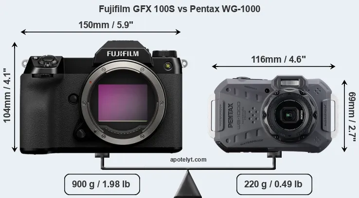 The physical size and weight of the Fujifilm GFX 100S and the Pentax WG-1000 are illustrated in the side-by-side display below. The two cameras are presented according to their relative size. Three successive views from the front, the top, and the rear are shown. All width, height and depth measures are rounded to the nearest millimeter.