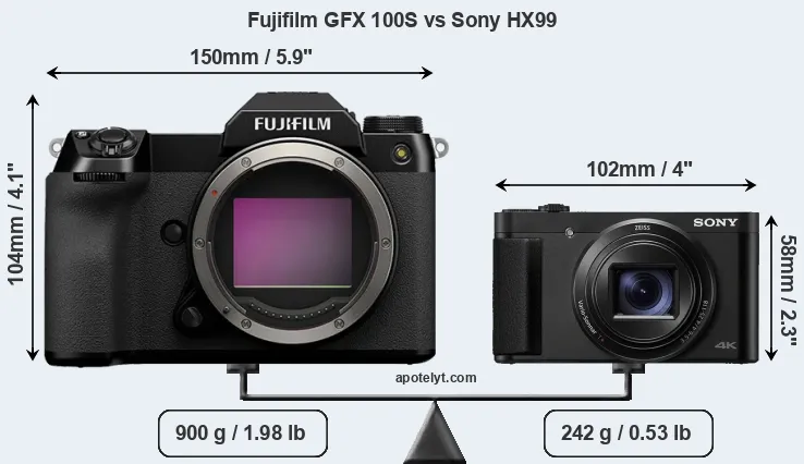 An illustration of the physical size and weight of the Fujifilm GFX 100S and the Sony HX99 is provided in the side-by-side display below. The two cameras are presented according to their relative size. Three consecutive views from the front, the top, and the rear side are shown. All width, height and depth dimensions are rounded to the nearest millimeter.