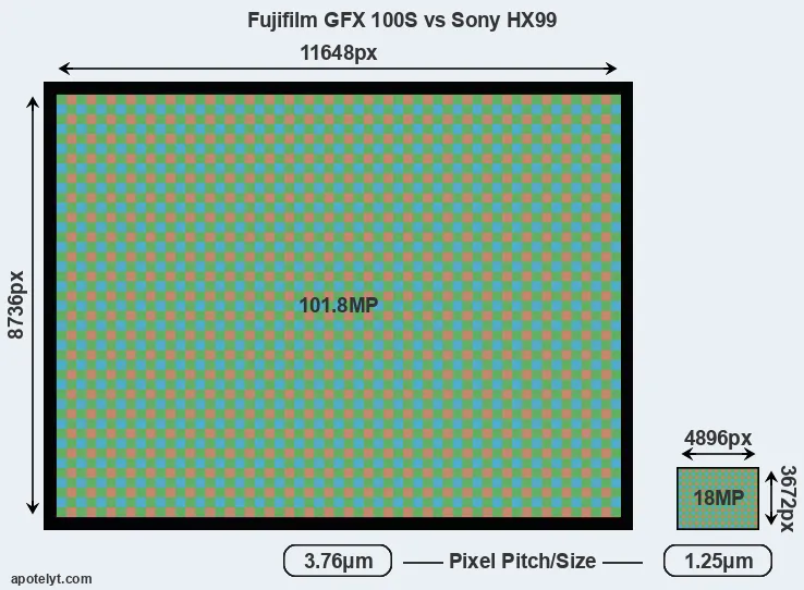 | Sensor Specs | Fujifilm GFX 100S | Sony HX99 |