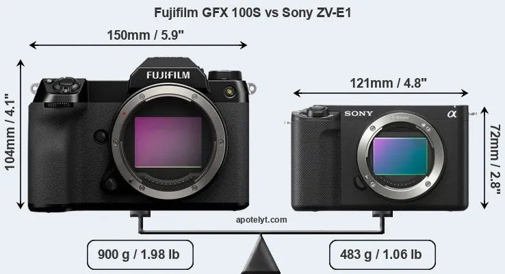 The physical size and weight of the Fujifilm GFX 100S and the Sony ZV-E1 are illustrated in the side-by-side display below. The two cameras are presented according to their relative size. Three consecutive perspectives from the front, the top, and the back are available. All width, height and depth measures are rounded to the nearest millimeter.