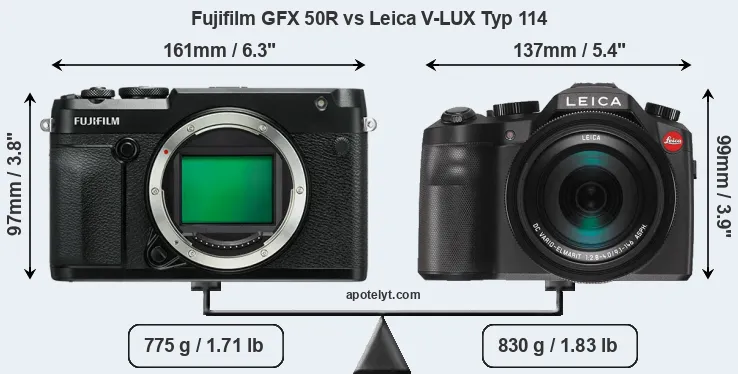 Going beyond this snapshot of core features and characteristics, what are the differences between the Fujifilm GFX 50R and the Leica V-LUX (Typ 114)? Which one should you buy? Read on to find out how these two cameras compare with respect to their body size, their imaging sensors, their shooting features, their input-output connections, and their reception by expert reviewers.