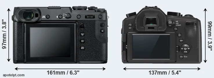 The side-by-side display below illustrates the physical size and weight of the Fujifilm GFX 50R and the Leica V-LUX Typ 114. The two cameras are presented according to their relative size. Three successive views from the front, the top, and the rear are shown. All width, height and depth dimensions are rounded to the nearest millimeter.