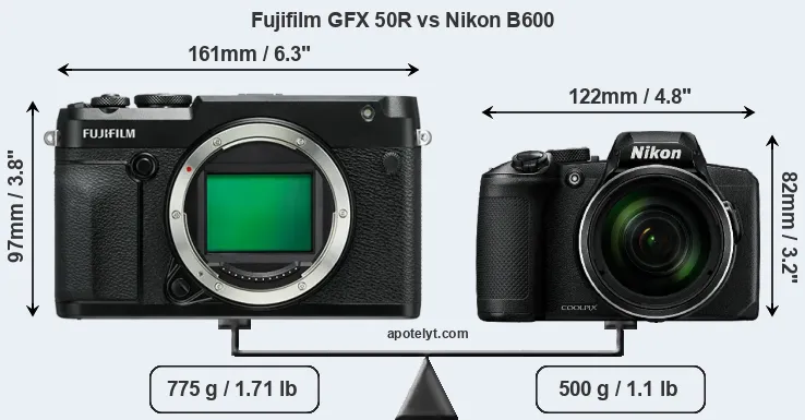 | Body Specs | Fujifilm GFX 50R | Nikon B600 |