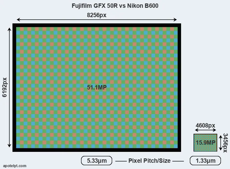| Sensor Specs | Fujifilm GFX 50R | Nikon B600 |