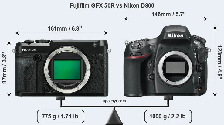 An illustration of the physical size and weight of the Fujifilm GFX 50R and the Nikon D800 is provided in the side-by-side display below. The two cameras are presented according to their relative size. Three consecutive perspectives from the front, the top, and the back are available. All width, height and depth measures are rounded to the nearest millimeter.