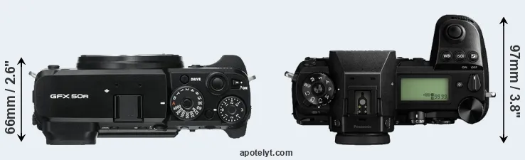 An illustration of the physical size and weight of the Fujifilm GFX 50R and the Panasonic S1 is provided in the side-by-side display below. The two cameras are presented according to their relative size. Three successive views from the front, the top, and the rear are shown. All width, height and depth measures are rounded to the nearest millimeter.