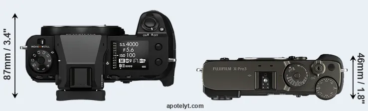 The side-by-side display below illustrates the physical size and weight of the Fujifilm GFX 50S II and the Fujifilm X-Pro3. The two cameras are presented according to their relative size. Three consecutive perspectives from the front, the top, and the back are available. All width, height and depth measures are rounded to the nearest millimeter.