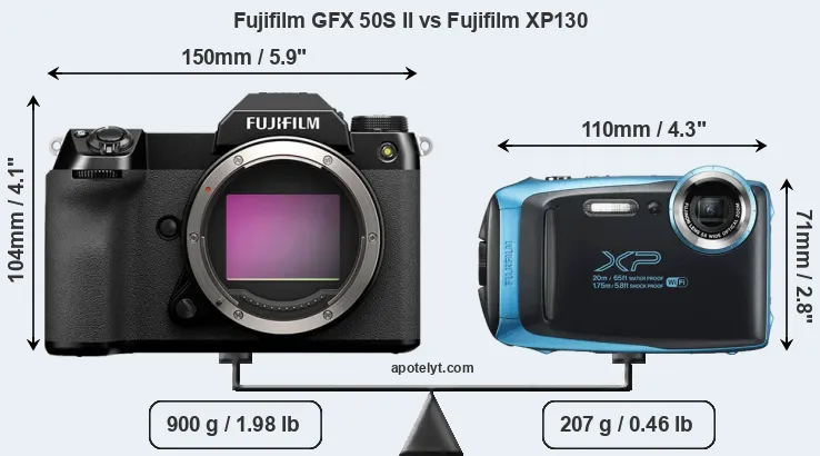 An illustration of the physical size and weight of the Fujifilm GFX 50S II and the Fujifilm XP130 is provided in the side-by-side display below. The two cameras are presented according to their relative size. Three consecutive views from the front, the top, and the rear side are shown. All width, height and depth dimensions are rounded to the nearest millimeter.