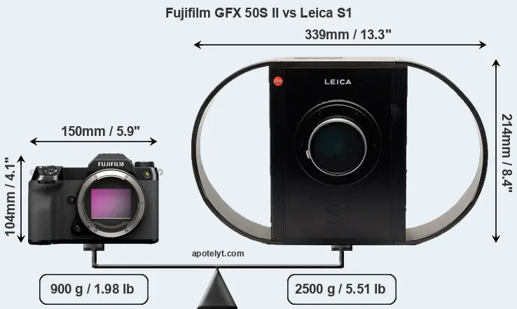 If the front view area (width x height) of the cameras is taken as an aggregate measure of their size, the Leica S1 is considerably larger (365 percent) than the Fujifilm GFX 50S II. Moreover, the S1 is substantially heavier (178 percent) than the GFX 50S II. It is worth mentioning in this context that the GFX 50S II is splash and dust resistant, while the S1 does not feature any corresponding weather-sealing.