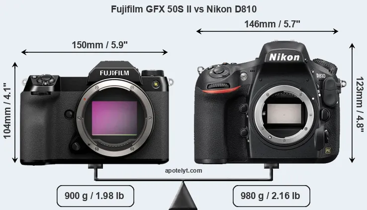 The side-by-side display below illustrates the physical size and weight of the Fujifilm GFX 50S II and the Nikon D810. The two cameras are presented according to their relative size. Three successive views from the front, the top, and the rear are shown. All size dimensions are rounded to the nearest millimeter.
