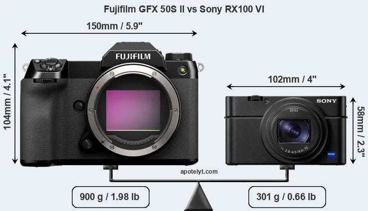 The physical size and weight of the Fujifilm GFX 50S II and the Sony RX100 VI are illustrated in the side-by-side display below. The two cameras are presented according to their relative size. Three successive views from the front, the top, and the rear are shown. All width, height and depth dimensions are rounded to the nearest millimeter.