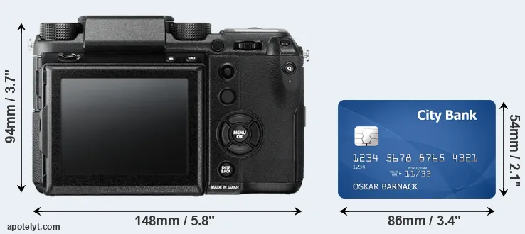 An illustration of the physical dimensions of the Fujifilm GFX 50S vis-à-vis a credit card is provided in the side-by-side display below. Three consecutive perspectives from the front, the top, and the back are presented. All size dimensions are rounded to the nearest millimeter.