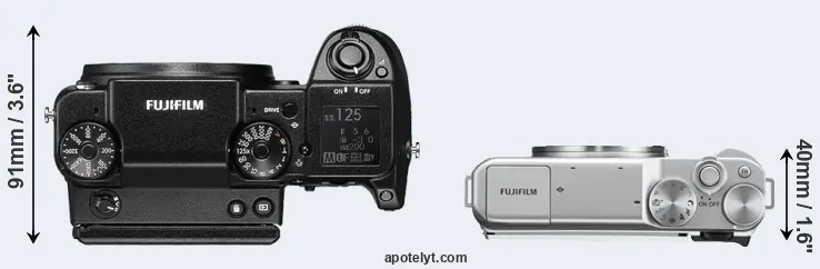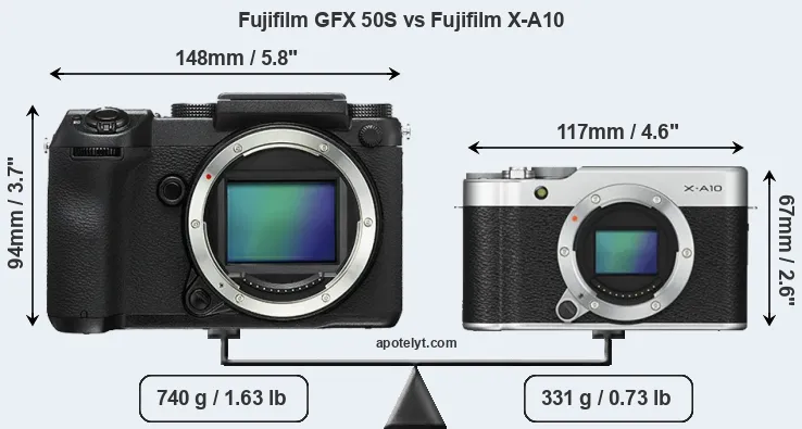 An illustration of the physical size and weight of the Fujifilm GFX 50S and the Fujifilm X-A10 is provided in the side-by-side display below. The two cameras are presented according to their relative size. Three consecutive perspectives from the front, the top, and the back are available. All width, height and depth dimensions are rounded to the nearest millimeter.