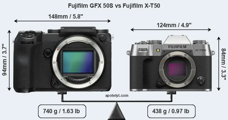 If the front view area (width x height) of the cameras is taken as an aggregate measure of their size, the Fujifilm X-T50 is notably smaller (25 percent) than the Fujifilm GFX 50S. Moreover, the X-T50 is substantially lighter (41 percent) than the GFX 50S. It is worth mentioning in this context that the GFX 50S is splash and dust resistant, while the X-T50 does not feature any corresponding weather-sealing.