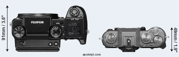 The physical size and weight of the Fujifilm GFX 50S and the Fujifilm X-T50 are illustrated in the side-by-side display below. The two cameras are presented according to their relative size. Three consecutive views from the front, the top, and the rear side are shown. All size dimensions are rounded to the nearest millimeter.