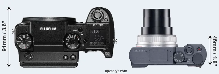 If the front view area (width x height) of the cameras is taken as an aggregate measure of their size, the Leica C-LUX is considerably smaller (46 percent) than the Fujifilm GFX 50S. It is worth mentioning in this context that the GFX 50S is splash and dust resistant, while the C-LUX does not feature any corresponding weather-sealing.